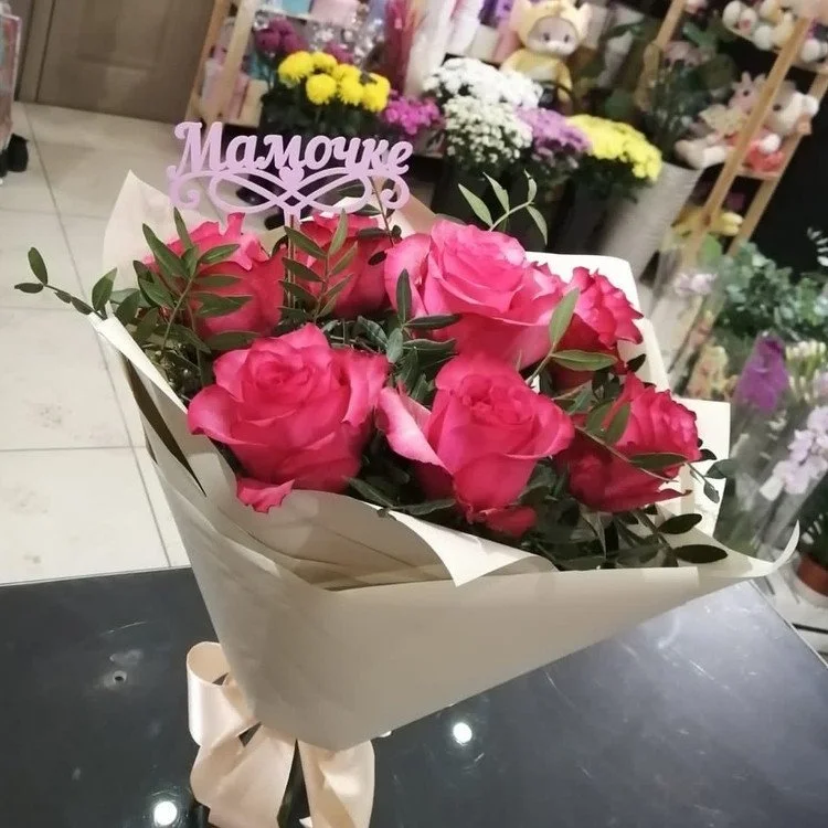- Средний - роза - 9 шт., зелень, топпер, упаковка, лента