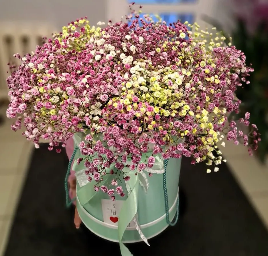 Подарите шляпную коробку с разноцветной гипсофилой своим близким, и вы увидите, как это символ нежности и любви способно вызвать искреннюю улыбку и радость!