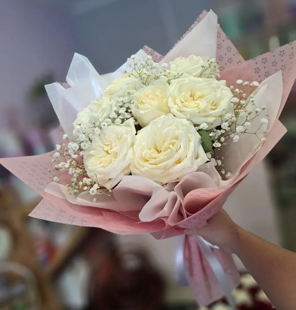 Подарите букет из белых пионовидных роз и гипсофилы своим близким или украсьте им свое событие. Этот букет станет украшением любого интерьера и подарит всем радость и вдохновение!