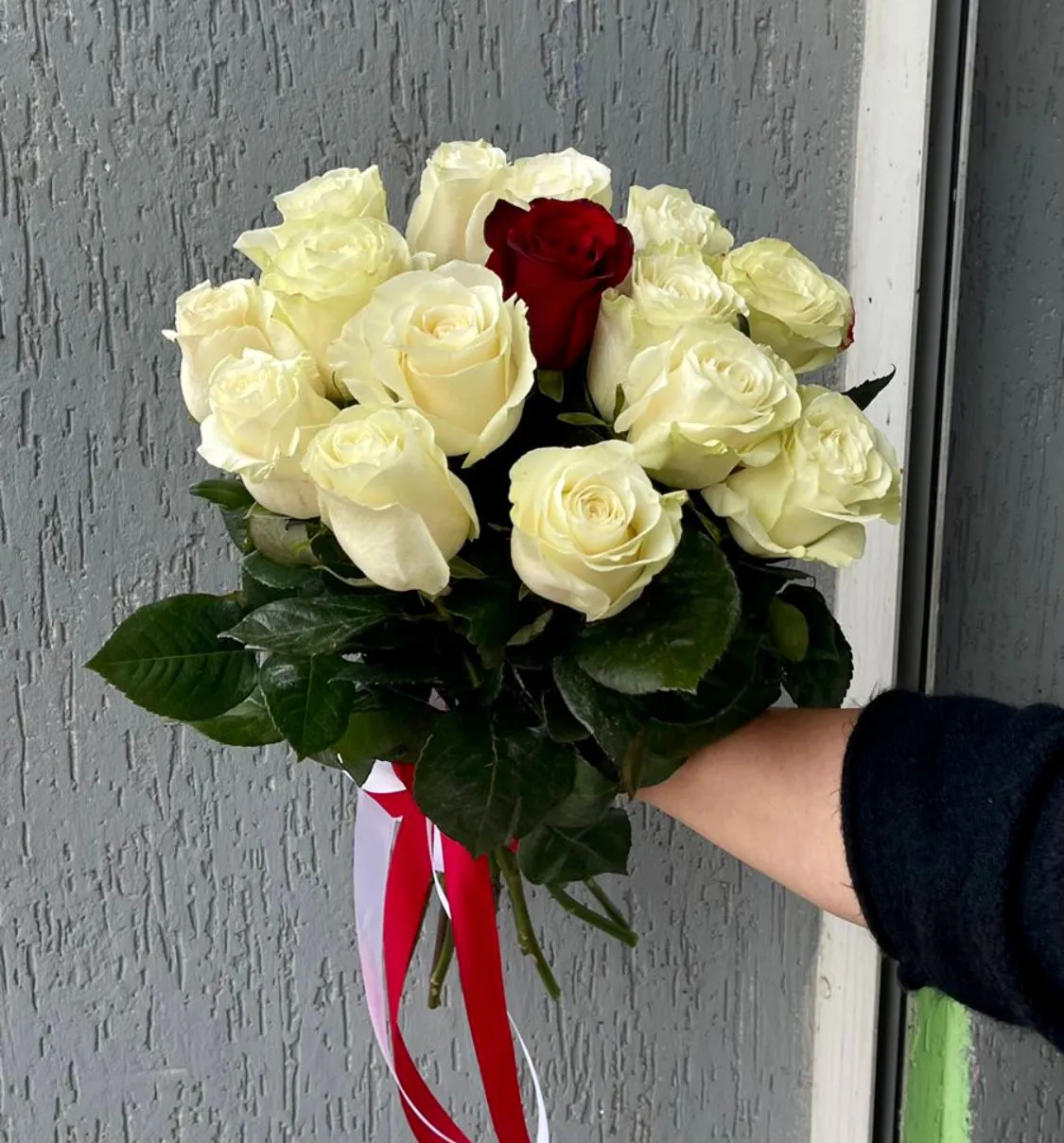 Оригинальный букет с одной красной розой в середине  белых роз. Выглядит  невероятно стильно и воздушно. Однозначно понравится и вызовет самые яркие эмоции.