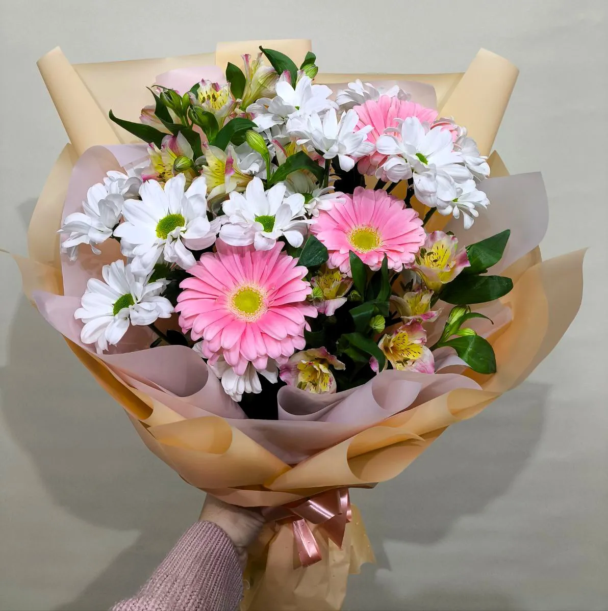 Наш сборный букет из хризантем, альстромерий и гербер – это настоящее торжество красок и форм! Каждый цветок в нем словно рассказывает свою историю, сплетаясь в единую мелодию красоты.