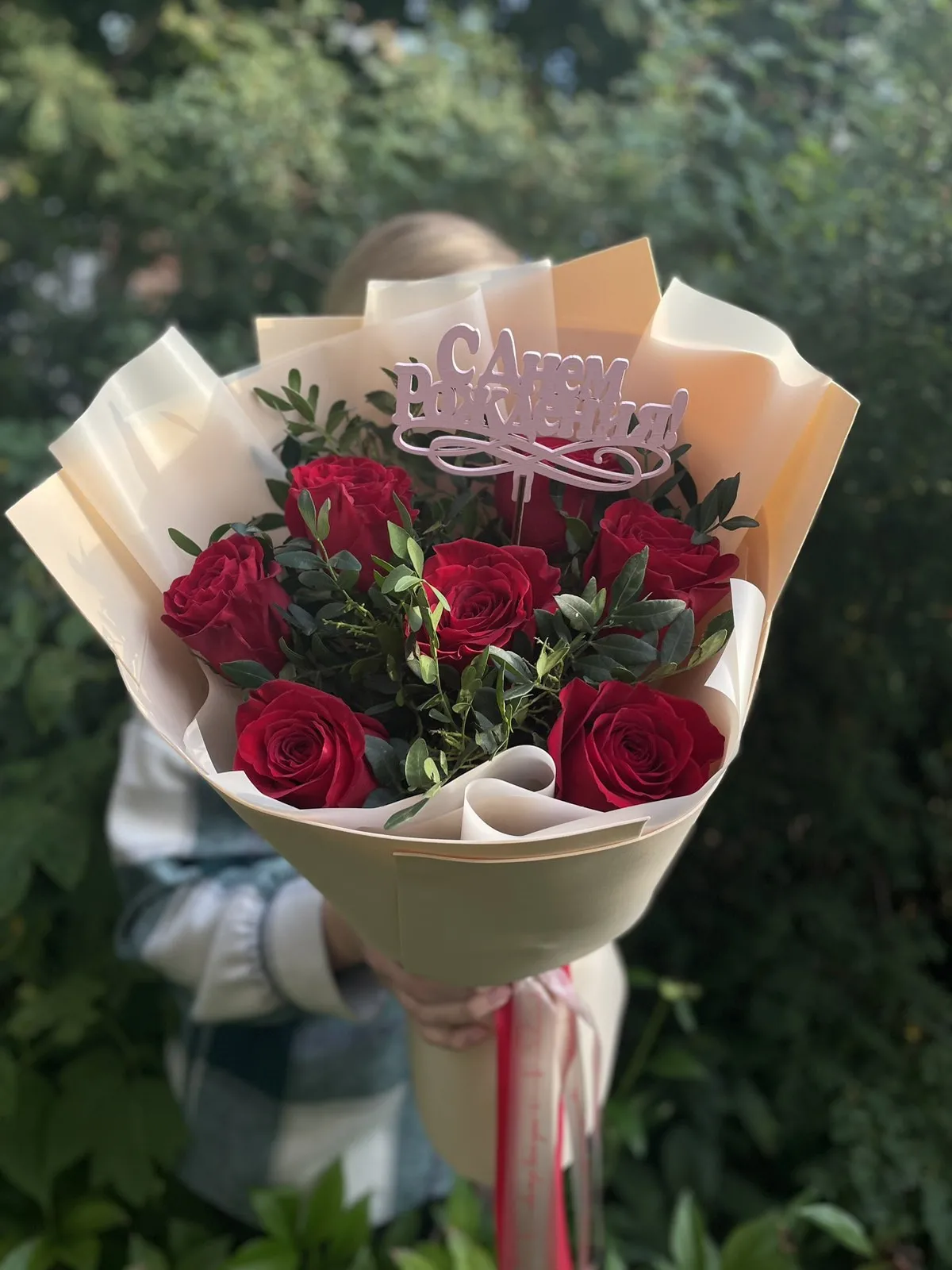Листва, словно мягкая вуаль, обрамляет каждую розу, подчеркивая их красоту и добавляя свежести. Аромат, исходящий от этого букета, сладок и съялен, наполняет атмосферу нежностью и радостью. Идеально подходит в качестве подарка на день рождения, этот букет станет ярким акцентом и создаст атмосферу праздника. Подарите своим близким этот чудесный символ любви и уважения!