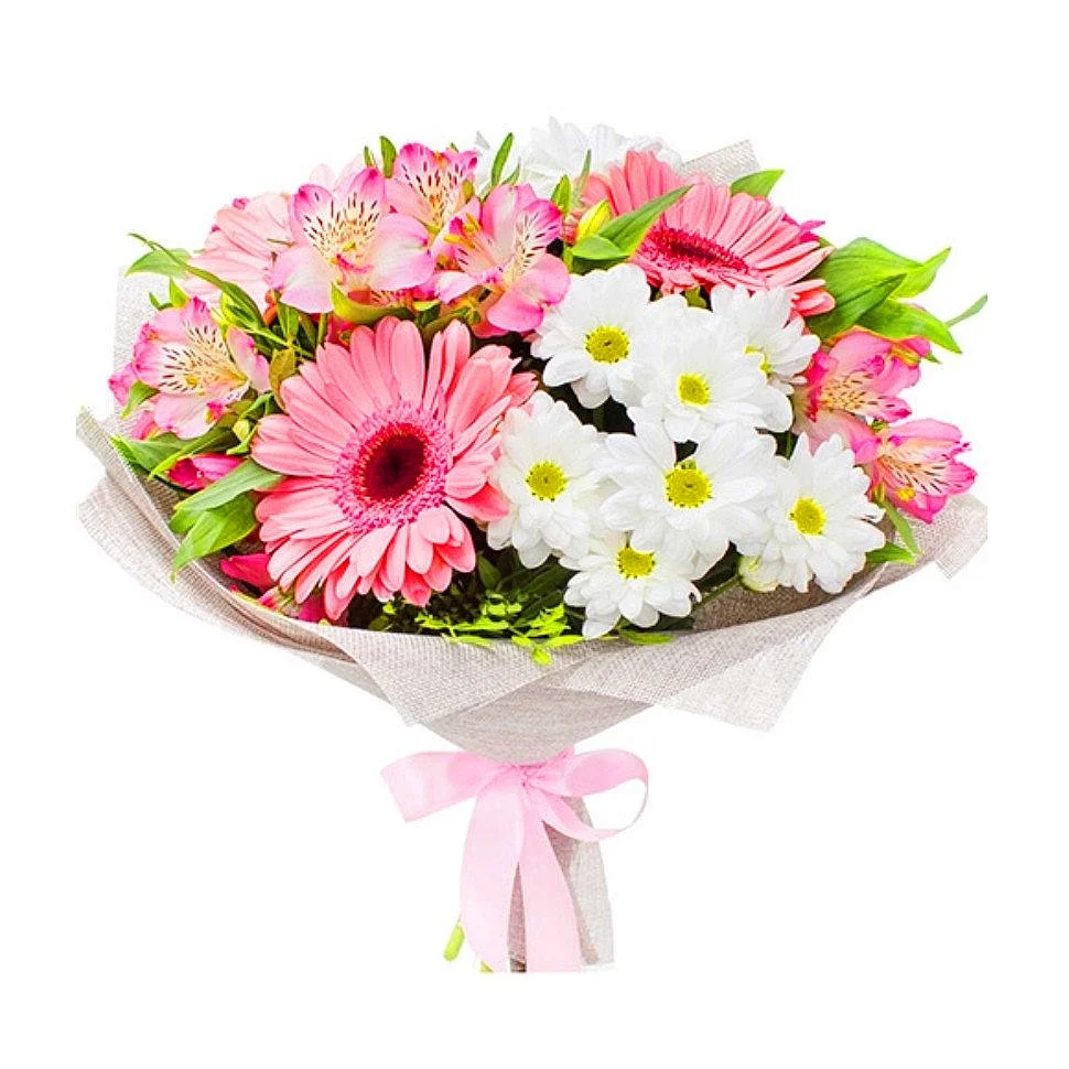 Вариант—Стандарт - гербера - 3 шт., хризантема - 2 шт., альстромерия - 3 шт., зелень, упаковка, лента