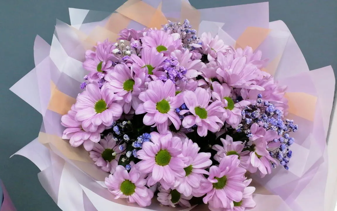 кустовая хризантема , гипсофила , упаковка, лента