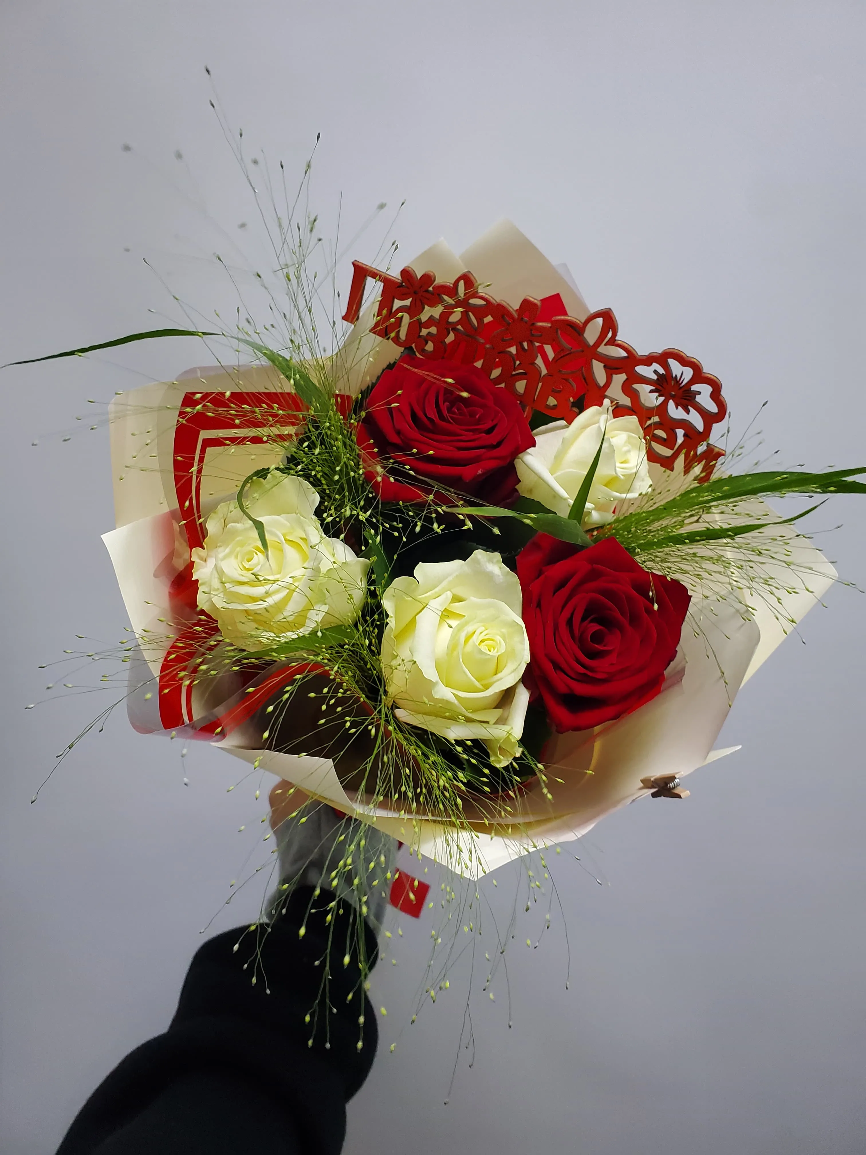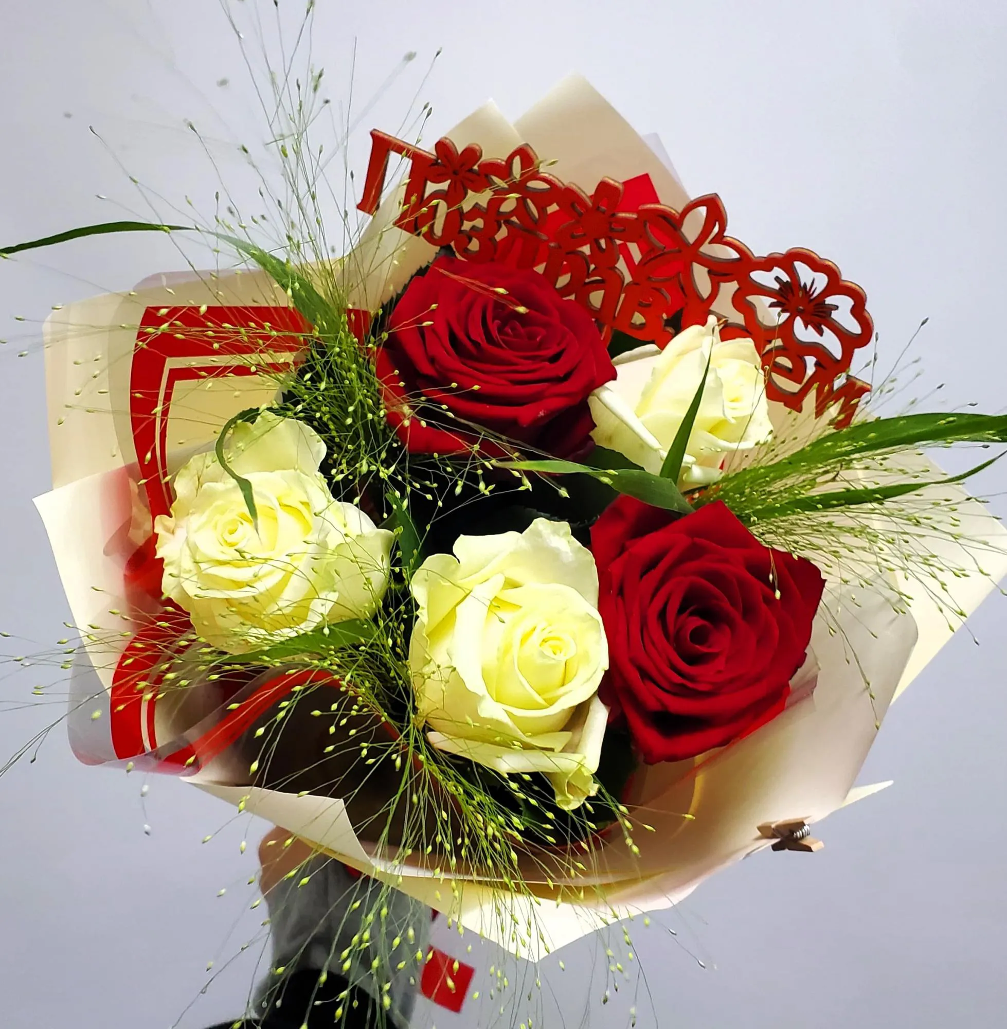 Этот удивительный букет из красных и белых роз — настоящий символ любви и искренних чувств. Красные розы, олицетворяющие страсть и восхищение, гармонично сочетаются с нежными белыми розами, которые говорят о чистоте и искренности. Зеленые листья, обрамляющие цветы, придают композиции свежесть и живость, словно приносят кусочек природы в ваш дом.
